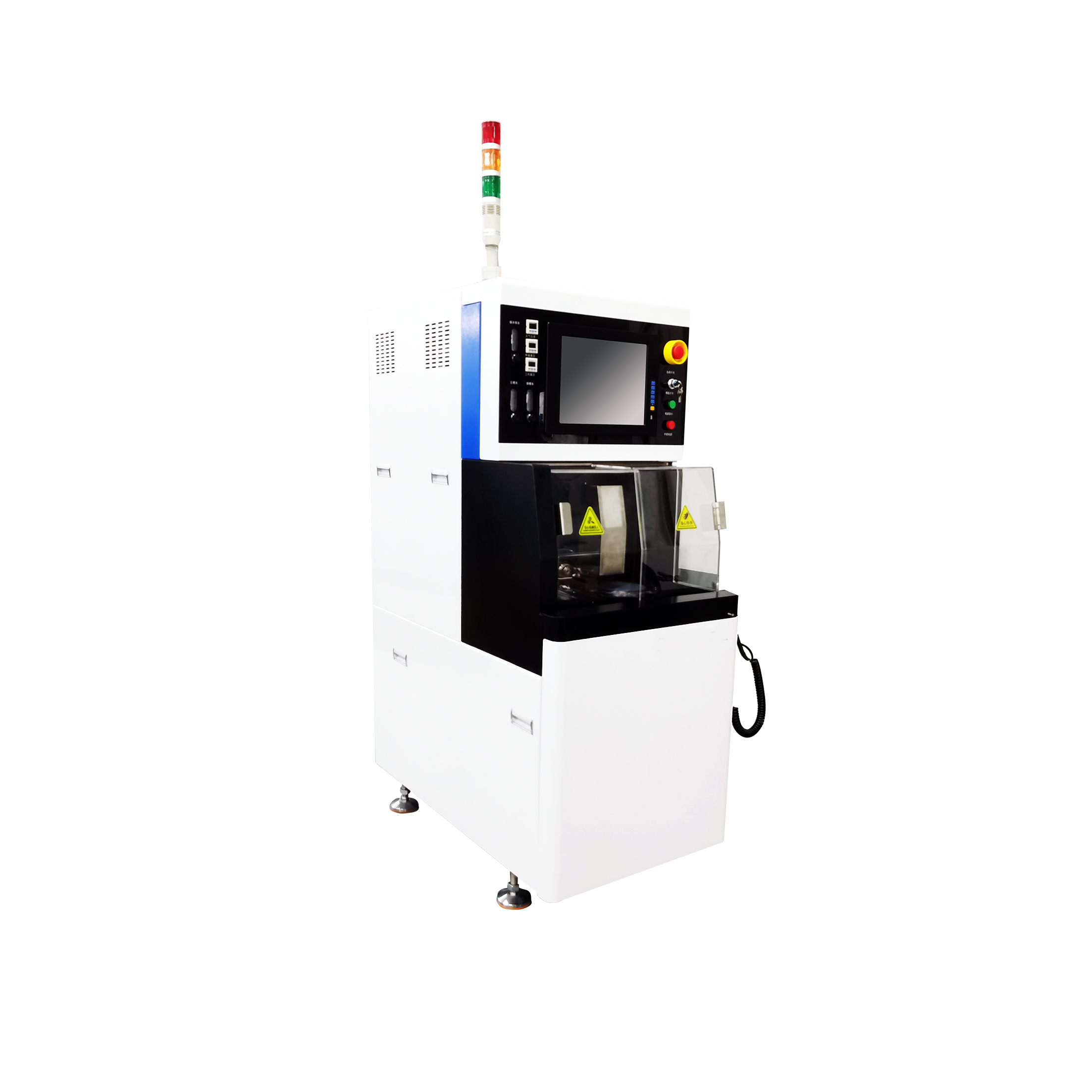 低气压、水压、工作台伺服、转台伺服、主轴驱动、测高系统、控制系统的故障报警,操作腔门安全锁,漏水检测、主轴电流监控、真空不足保护功能。